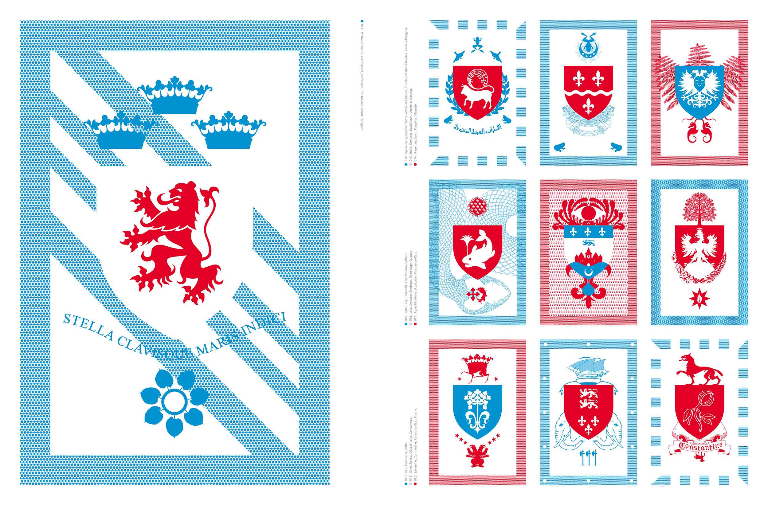 Anatomy of Identity is a reflection on what constitutes national identity. It is a celebration of multicultu- ralism and its creative potential. By combining the coats of arms of France — of its regions, departments, and main cities — with coats of arms from countries around the world, an unseen collection of heraldry emerges. The birth of chimeras through the chromatic prism, blue, white, red, of the French flag.